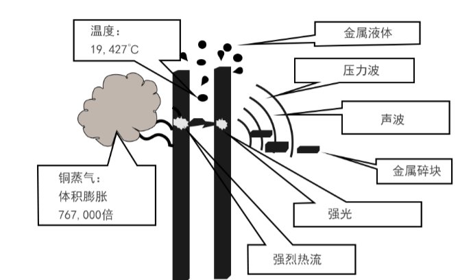 短路電流可能會誘發電弧過程。圖1-1是銅排之間產生的電弧,瞬間溫度接近20000°C,同時伴隨著強大的沖擊波以及灼熱的金屬碎塊、金屬液滴。圖1-2、圖1-3示出了短路時產生的電弧。一旦發生電弧,無論是對人還是對設備都會構成極大的威脅!