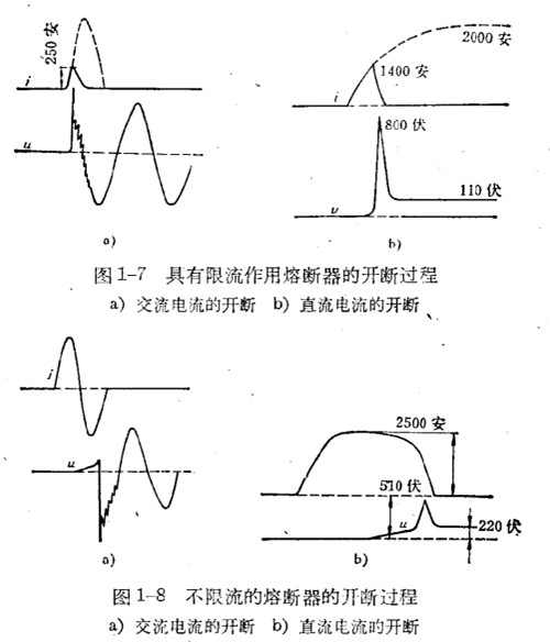 熔斷器按照開斷電流的性質可以分為限流和不限流的兩種:所謂限流的熔斷器是指當短路電流還未達到最大值Im時,已完成汽化、擊穿、間隙產生電弧和熄滅電弧的過程,并將電流2突然下降到零(圖1-7a為交流電流的開斷情況,b為直流電流的開斷情況);所謂不限流的熔斷器是指電路中的電流將從落繼續上升,’如圖1-8中的悄況。在直流時,當電流達到接近短路電流的穩定狀態后,待電弧拉長到不足以維持時才熄滅。在交流時,短路電流將持續到第一次電流過零瞬間媳滅電弧。有時短路電流還可能繼續延到經過第二或第三次,電流過零瞬間才熄滅電弧。