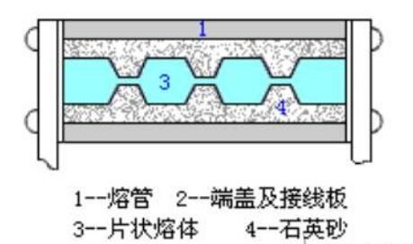 另外一種如下圖所示。熔體裝在有絕緣砂粒填料(如石英砂)的熔管內,在熔體斷開電路產生電弧時,絕緣砂??晌针娀∧芰?,金屬蒸氣能散發到砂粒的縫隙中,熔體很快冷卻,從而達到滅弧的目的。